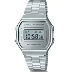 ساعت دیجیتال کلاسیک Casio A168 یکی از محبوبترین و نمادینترین مدلهای کاسیو با طراحی رترو و نوستالژیک است. این ساعت با بدنه استیل نقرهای و صفحه نمایش LCD همراه با نورپردازی پسزمینه، ترکیبی از سبک قدیمی و کاربردی مدرن را ارائه میدهد.
